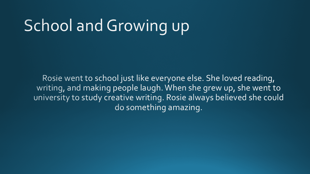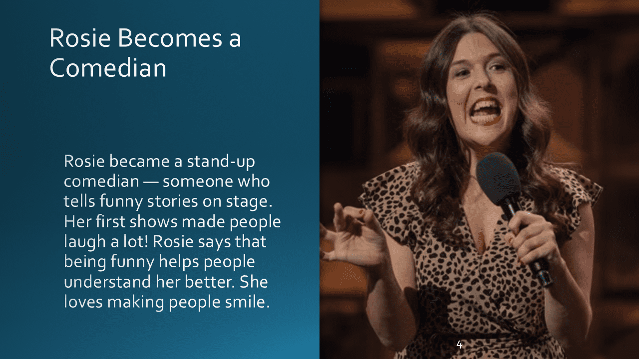 💬 Strong Communicator – With her experience as a comedian and writer, Rosie knows how to connect with people, making her a relatable and engaging leader.
