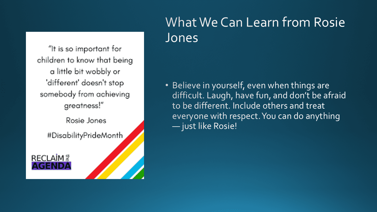 🌟 Inspiring Role Model – Rosie Jones shows that determination and self-belief can overcome challenges, setting a powerful example for students to follow.